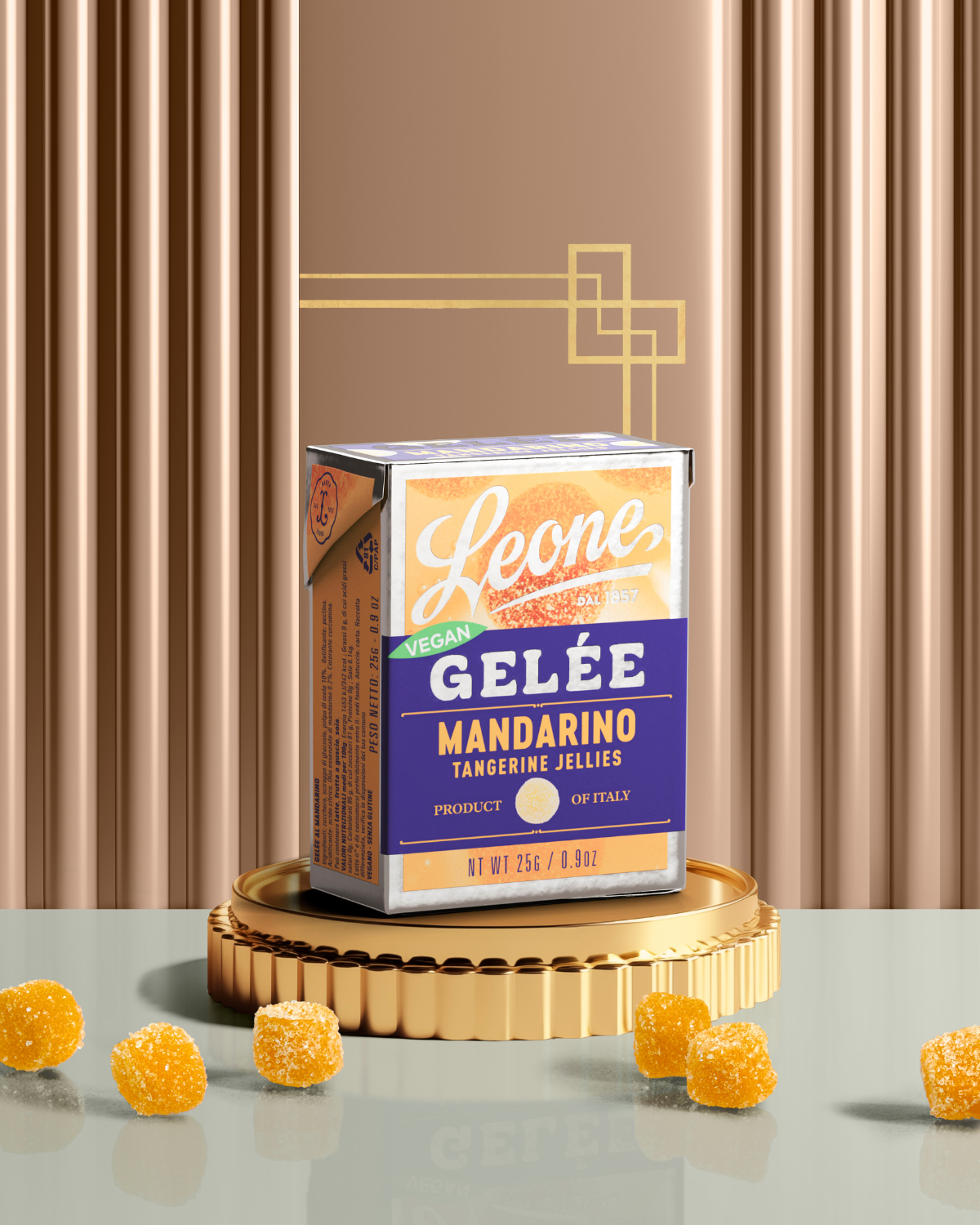Des gelées de mandarine ultra-moelleuses avec de la vraie pulpe de fruit, présentées dans un petit coffre aux trésors de délices à emporter partout avec soi.