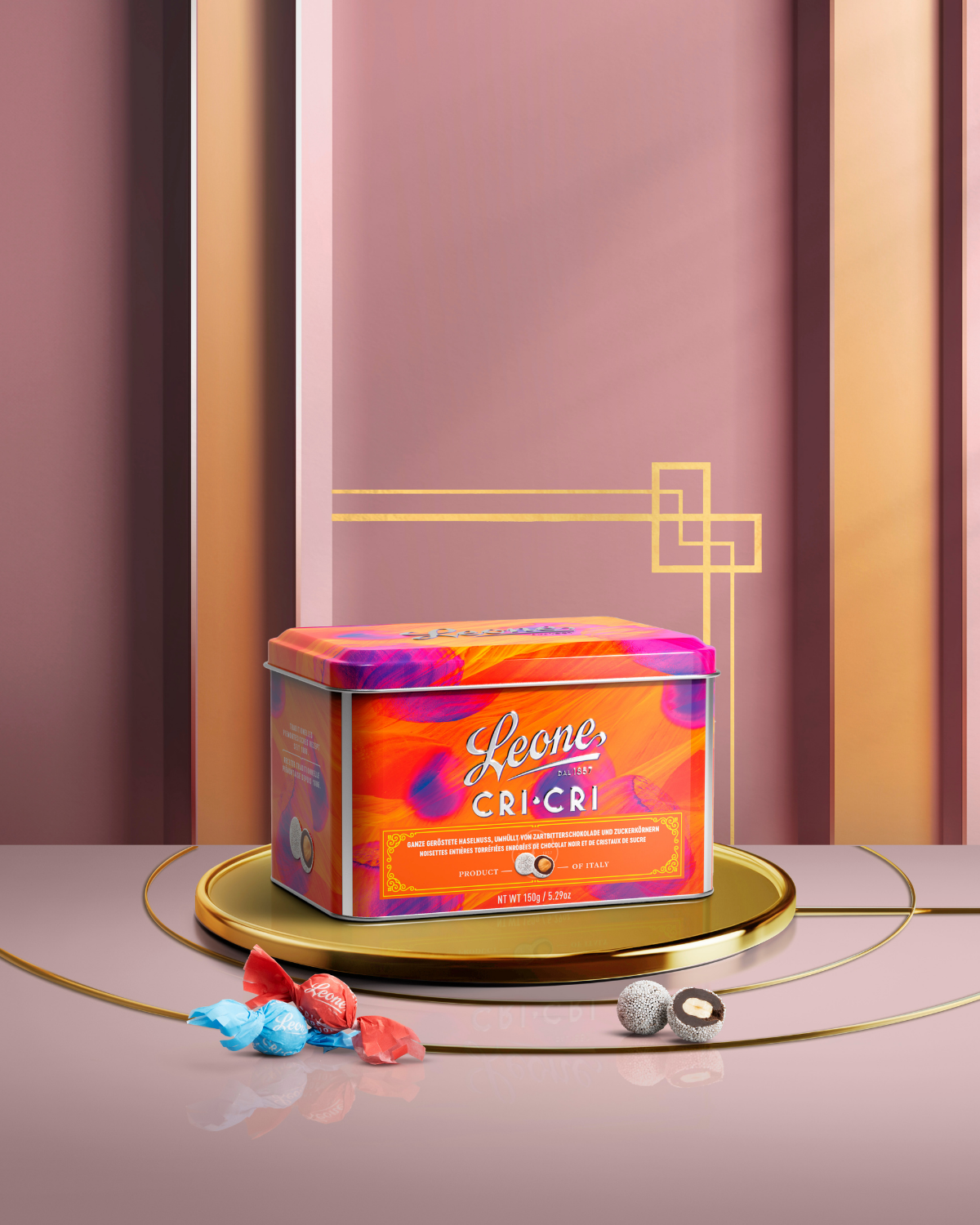Schokoladenpraline als Bonbon verkleidet. Kleine Köstlichkeiten mit geröstetem Haselnusskern, umhüllt von dunkler Schokolade und knusprigen Zuckerkörnern. Man kann nicht widerstehen, eins führt zum anderen!