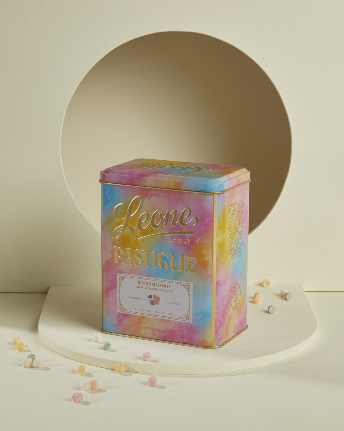 Eine große Dose voller kleiner zuckersüßer Schätze, eine Harmonie der Farben mit dem Geschmack von Zitrone, Orange, Mandarine, Erdbeere, Himbeere, Vanille und Veilchen.