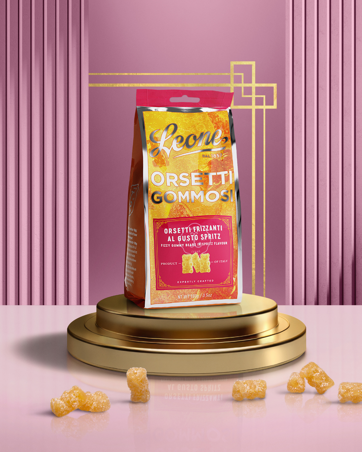 Eine Explosion aus Zitrusfrüchten und Bläschen in einem Bissen. Gummibärchen mit Spritzgeschmack enthalten die ganze Frische des beliebtesten Aperitifs und eine überraschend prickelnde Note.
