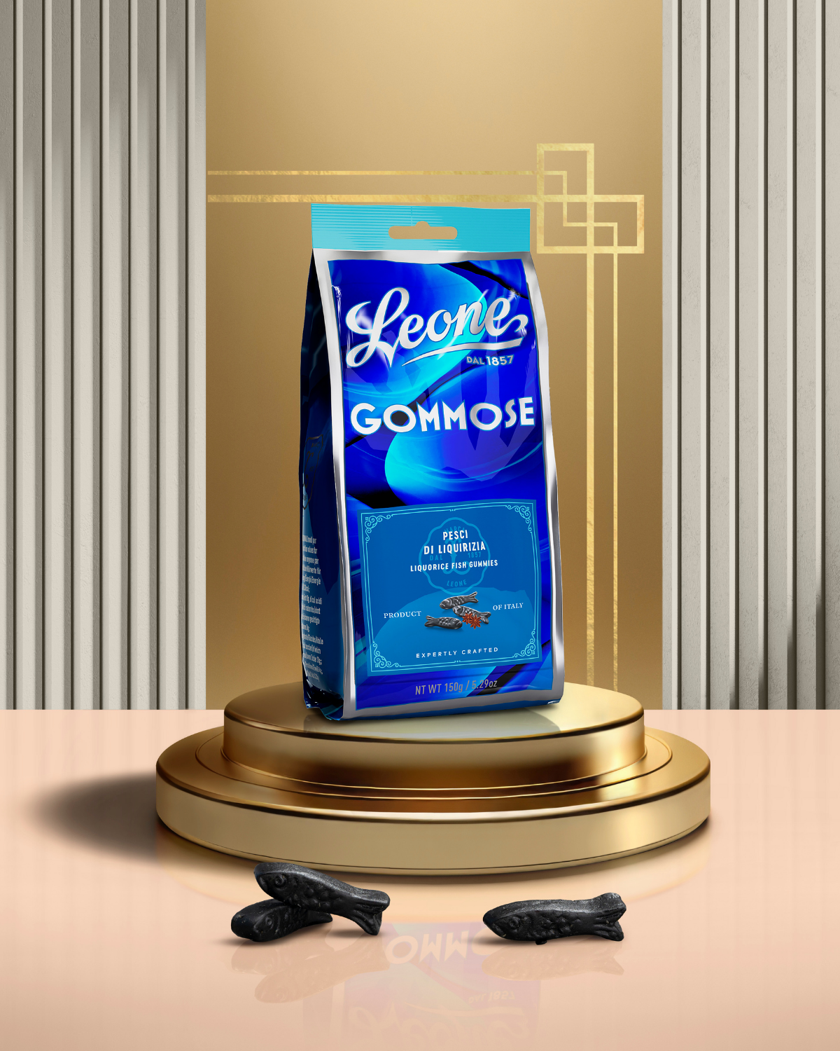 Ein eleganter und praktischer wiederverschließbarer Beutel mit kleinen Lakritzgummis in Fischform, ein Meer voller Köstlichkeiten mit einem Anis-Nachgeschmack.