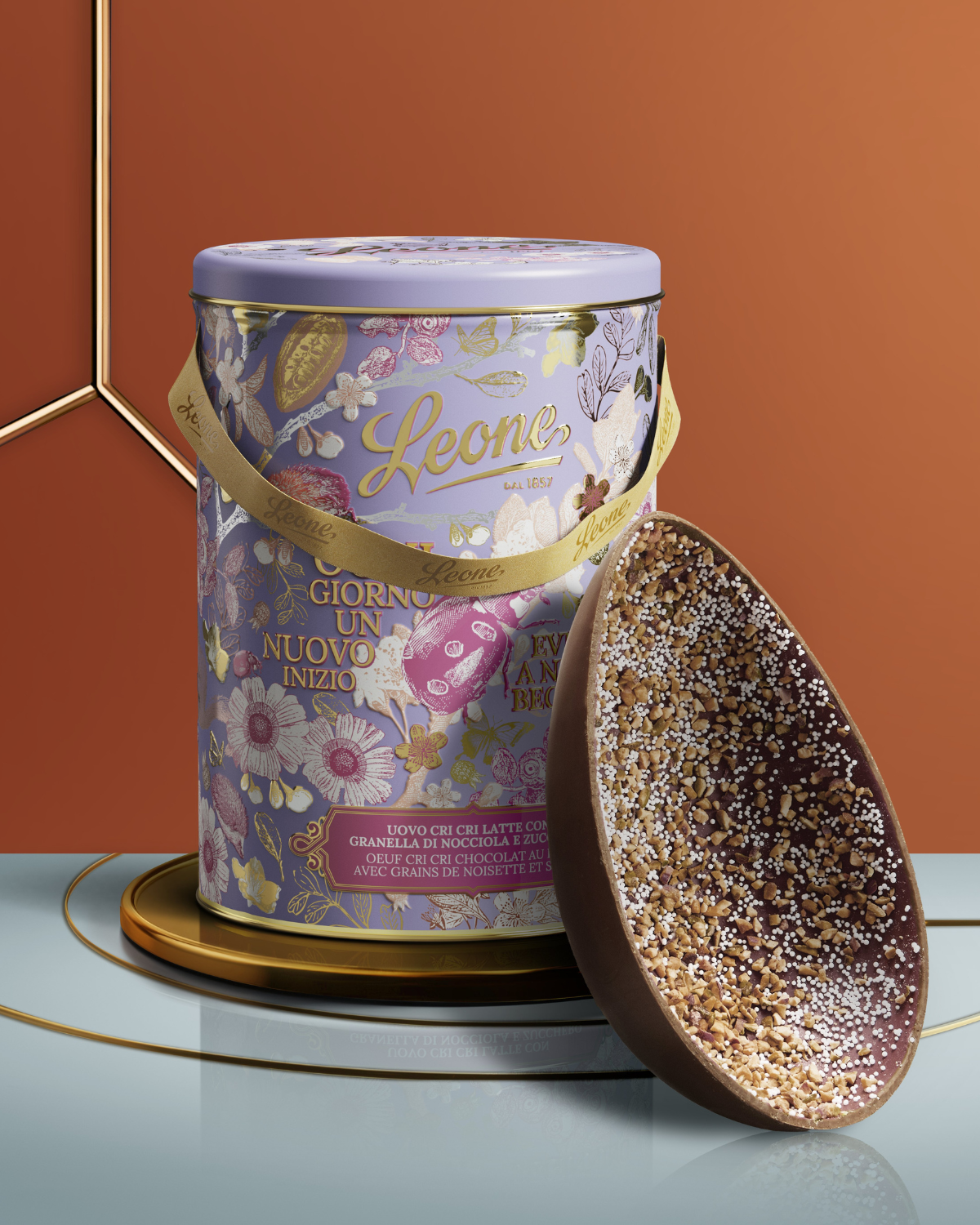 Milchschokoladenei mit Haselnusskrokant und Zuckerstreuseln. Zutaten: Milchschokolade 84,3 % (unraffinierter Rohrzucker, Kakaobutter, Vollmilchpulver (20 %), Kakaomasse und Kakaobohnen – mind. 40 % Kakaoanteil), „Piemonte“-Haselnusskrokant (g.g.A.) 10 %, Mompariglia 5,7 % (Zucker, Reisstärke, Glukosesirup). Kann Spuren von anderen Nüssen und Soja enthalten. Milchschokoladenei mit Haselnusskrokant und Zuckerstreuseln. Zutaten: Milchschokolade 84,3 % (unraffinierter Rohrzucker, Kakaobutter, Vollmilchpulver (20 %), Kakaomasse und Kakaobohnen – mind. 40 % Kakaoanteil), „Piemonte“-Haselnusskrokant (10 %), Zuckerstreusel (5,7 %) (Zucker, Maisstärke, Glukosesirup). Kann Spuren von Soja und anderen Nüssen enthalten.