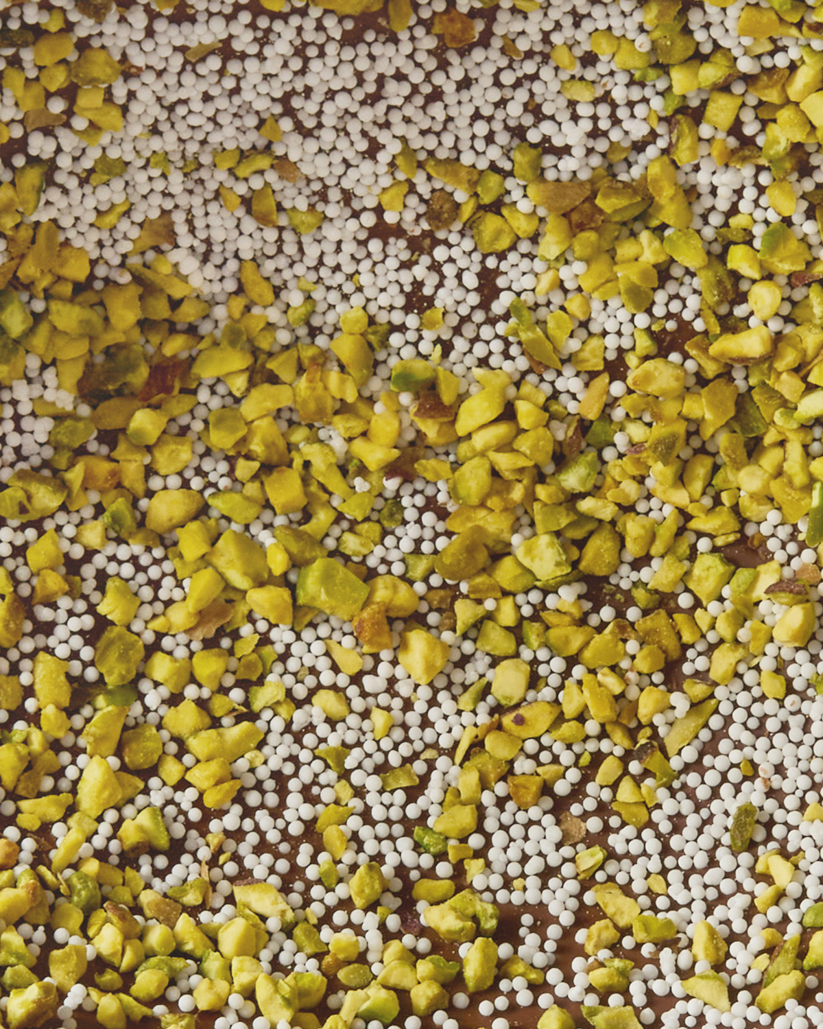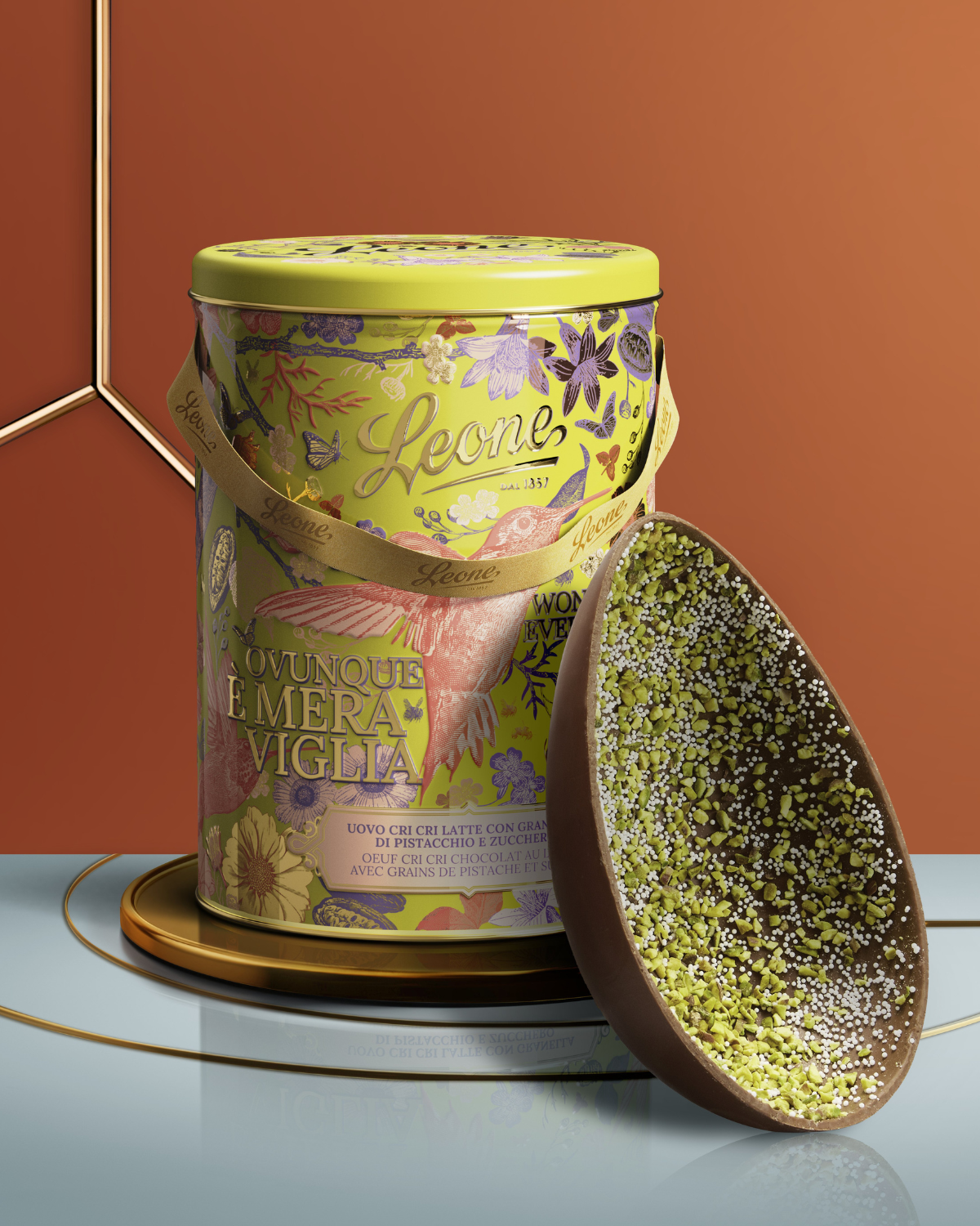 Milchschokoladenei mit Pistazienkrokant und Zuckerkristallen. Zutaten: Milchschokolade 84,3 % (unraffinierter Rohrzucker, Kakaobutter, Vollmilchpulver (20 %), Kakaomasse und Kakaobohnen – mind. 40 % Kakaoanteil), Pistazienkristalle 10 %, Mompariglia 5,7 % (Zucker, Reisstärke, Glukosesirup). Kann Spuren von anderen Nüssen und Soja enthalten.